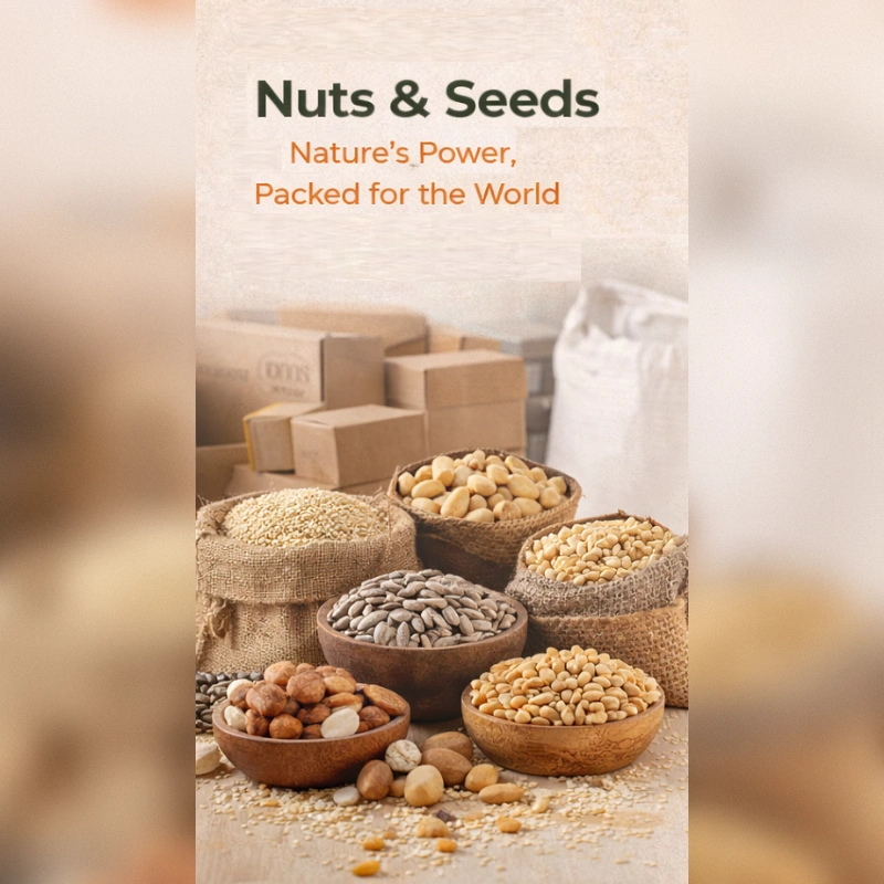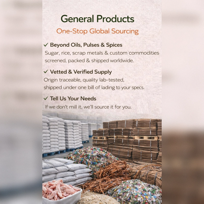 Our diverse product portfolio includes premium Cooking Oils, Nuts & Seeds, Spices, Pulses, Whole Grains, Fresh Fruits, Vegetables, and other general commodities — all carefully sourced to meet international quality standards. We collaborate closely with trusted farmers, suppliers, and sourcing partners, implementing strict quality control measures at every stage to ensure excellence in every shipment.